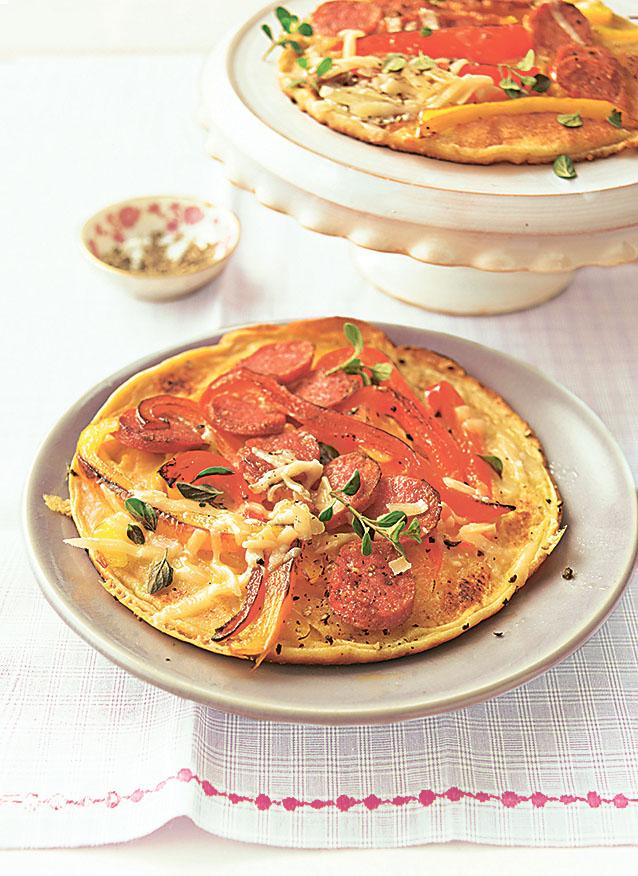 На 4 порции: •5 яиц •500 мл молока •400 г муки •1 ч. л. разрыхлителя •100 мл минеральной газированной воды •по 1 стручку красного и желтого сладкого перца •150 г копченой колбасы •растительное масло для жаренья •100 г тертого сыра •соль •молотый черный перец