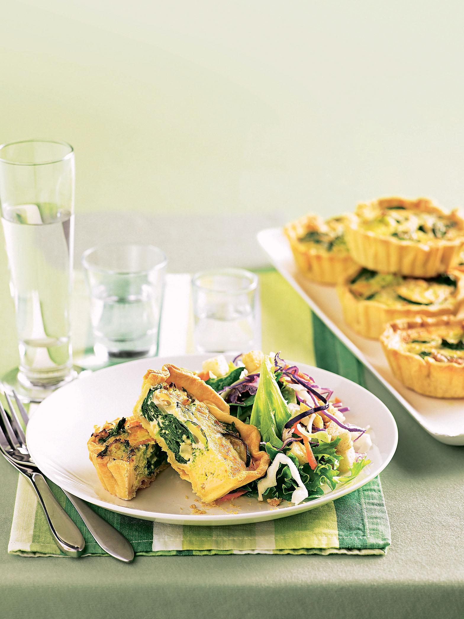 3 Духовку нагреть до 190°. Тесто разделить на 8 частей, каждую раскатать по размеру небольших формочек. Вырезать круги. Разложить их по формочкам, сделав бортики. Распределить по тесту цукини и рукколу.