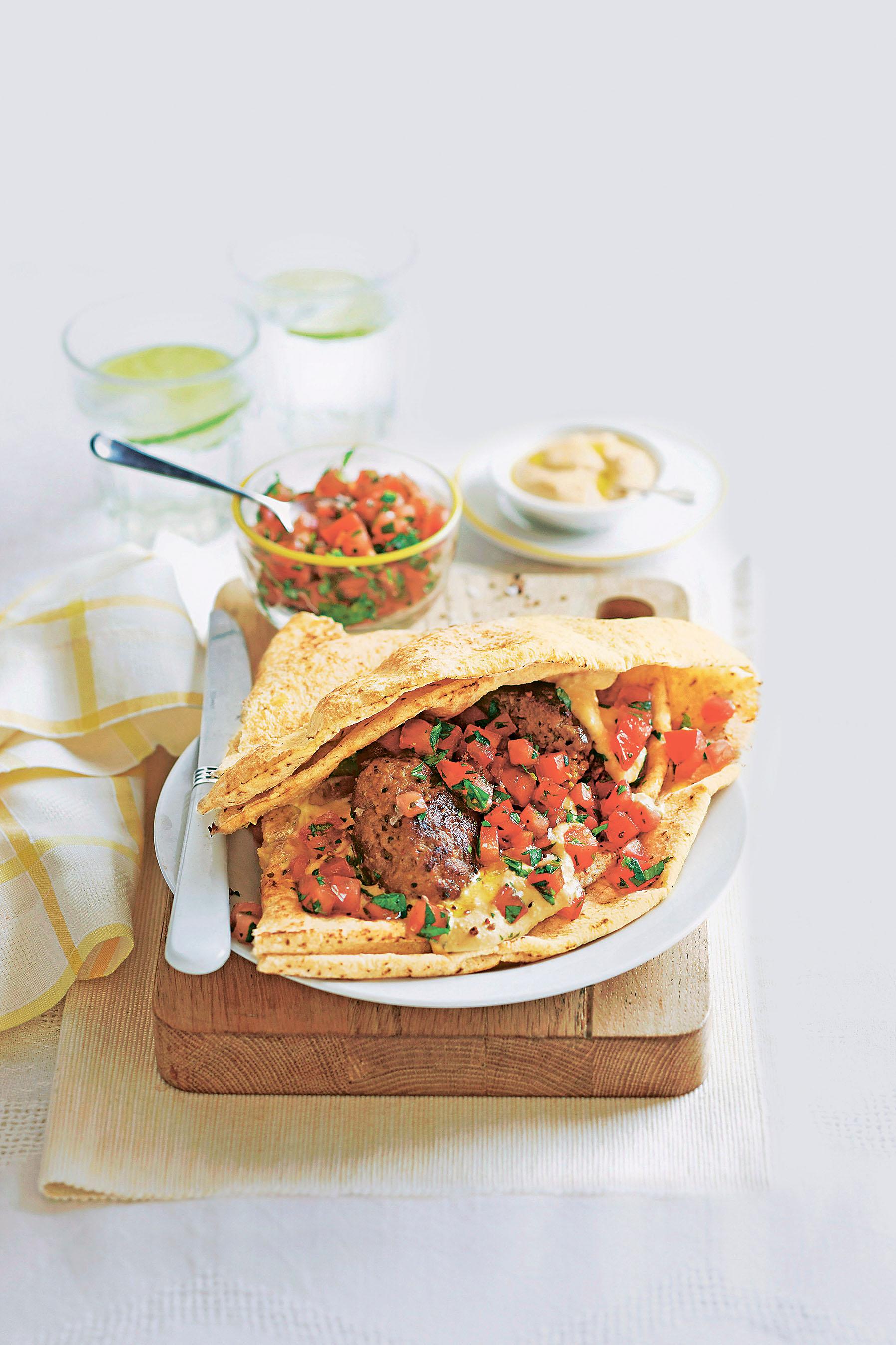 5 Каждую лепешку намазать массой из нута и добавить немного сальсы. Сложить пополам и положить фрикадельки. Лепешку еще раз сложить пополам.