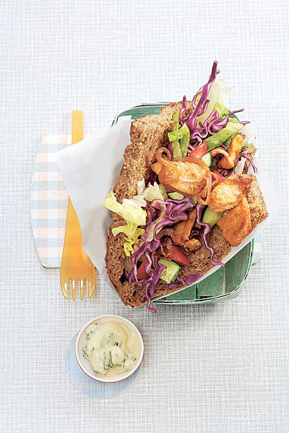 4 Филе индейки обжарить на растительном масле вместе с луком. Лаваш разрезать на половинки и каждую надрезать так, чтобы получился карман. Внутрь поместить овощи, филе индейки с луком и полить соусом.
