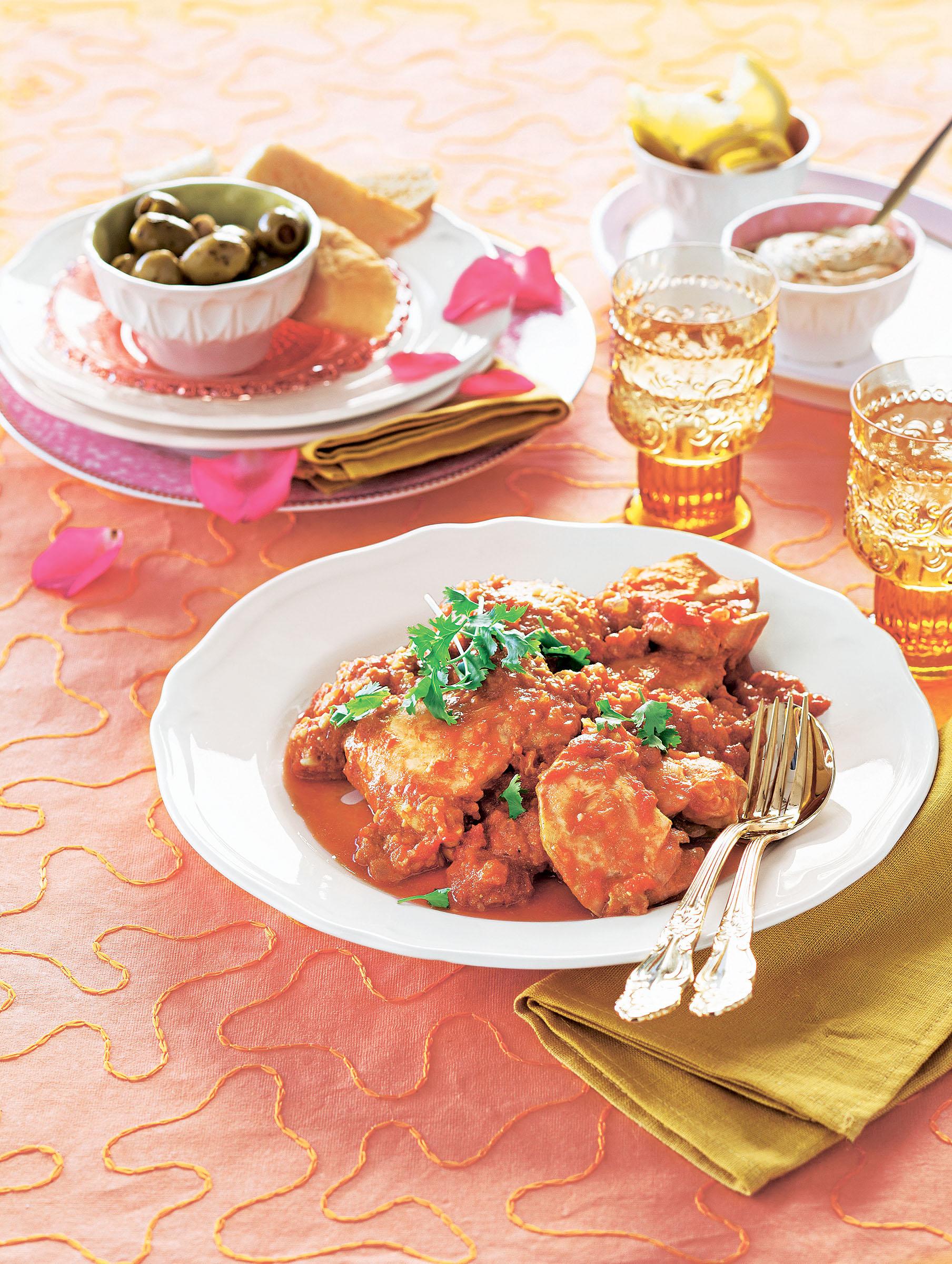2 В большой сковороде нагреть сливочное и оливковое масло, положить лук с чесноком и слегка подрумянить. Добавить куски курицы и обжарить на сильном огне до золотистой корочки. Посыпать специями, посолить и поперчить. Влить около 250 мл горячей воды, довести до кипения и тушить на маленьком огне под крышкой 10 мин.