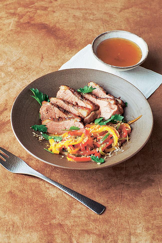 •50 г коричневого сахара •50 мл соевого соуса •сок 1 лайма •2 утиных филе •4 стручка сладкого перца •небольшой кусочек корня имбиря (2–3 см) •2 ст. л. кокосовой стружки •3 ст. л. растительного масла •150 мл кокосового молока •соль •молотый черный перец