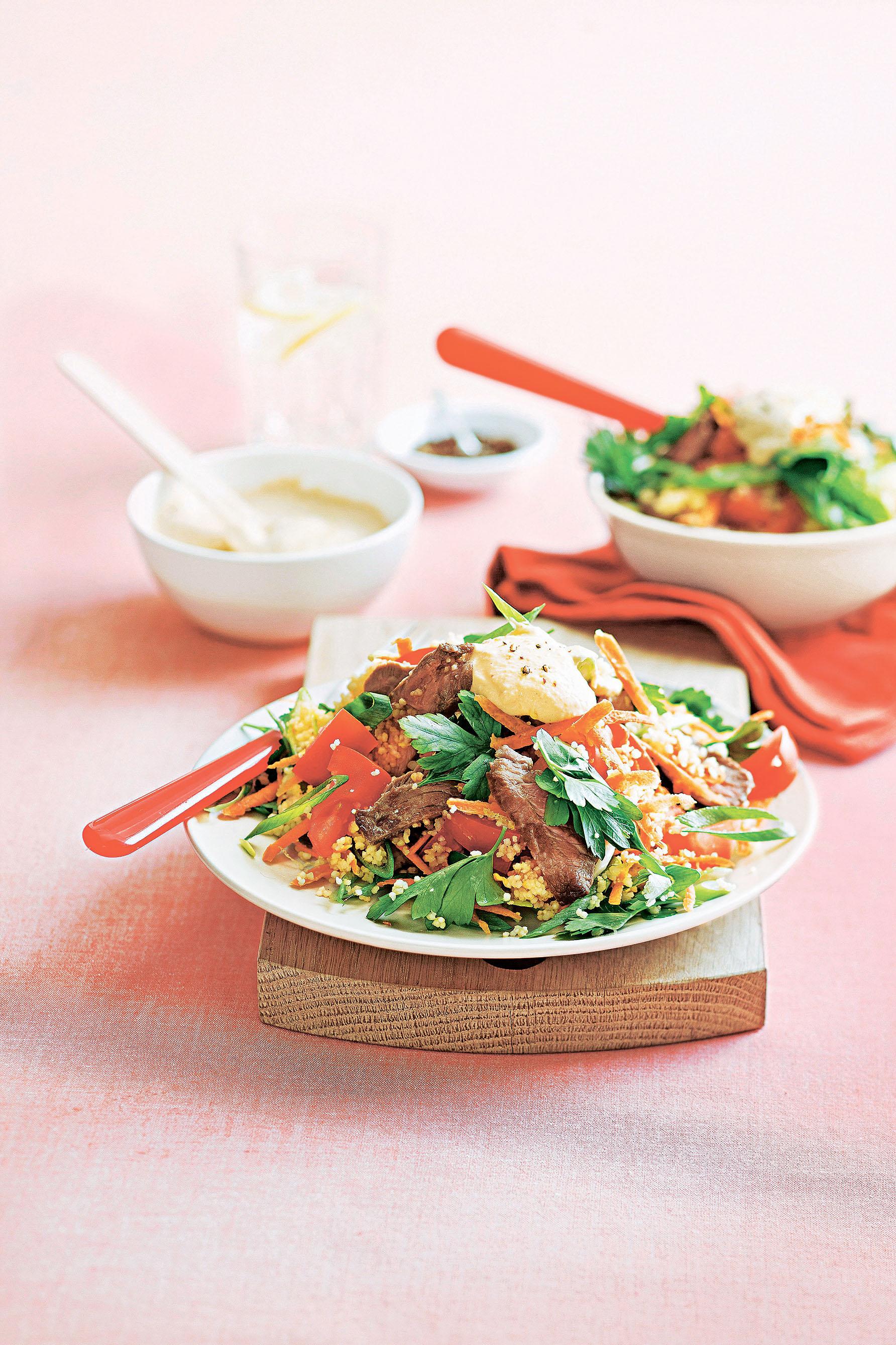 4. Подготовленные овощи, кускус, лимонную цедру и петрушку перемешать. Сок лимона с оставшимся маслом и щепоткой сахара взбить, посолить и поперчить. Получившимся соусом заправить овощи с кускусом. Сверху положить мясо. Можно подать с хумусом.