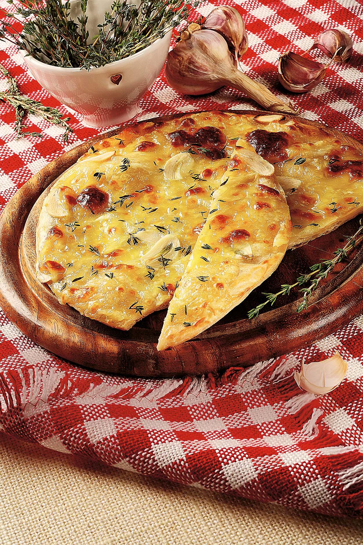 4. Чеснок распределить по лепешке, сверху положить кружки моцареллы. Посыпать листочками тимьяна и выпекать в духовке 10–15 мин. Нарезать и немедленно подать на стол.