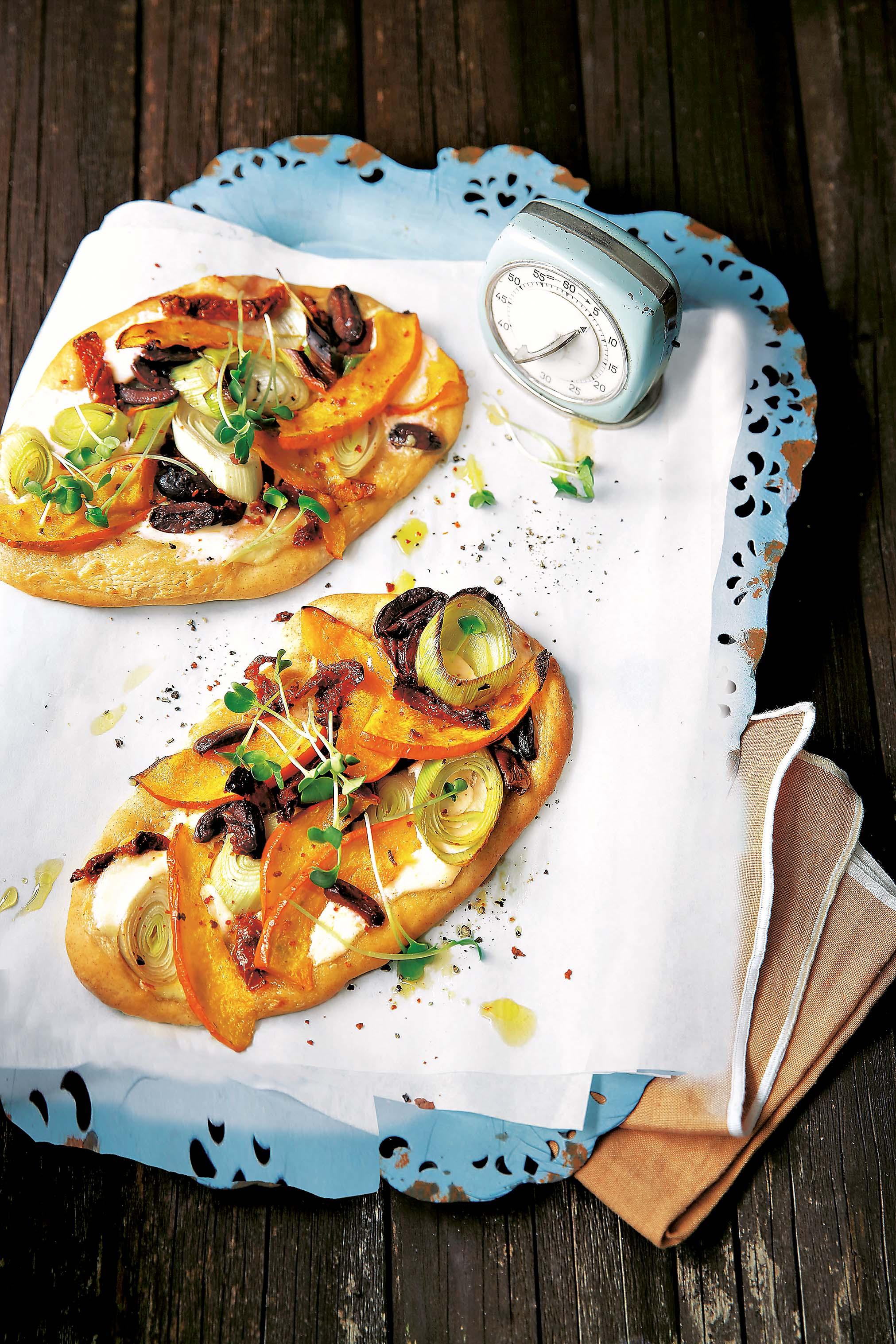 3. На лепешки намазать рикотту, посолить и поперчить по вкусу. Затем сверху уложить ломтики тыквы, колечки лукапорея, маслины и сушеные томаты. Посыпать тертым сыром. Пиццу выпекать в духовке около 10–15 мин. По желанию украсить зеленью. Нарезать ломтиками и подать на стол.