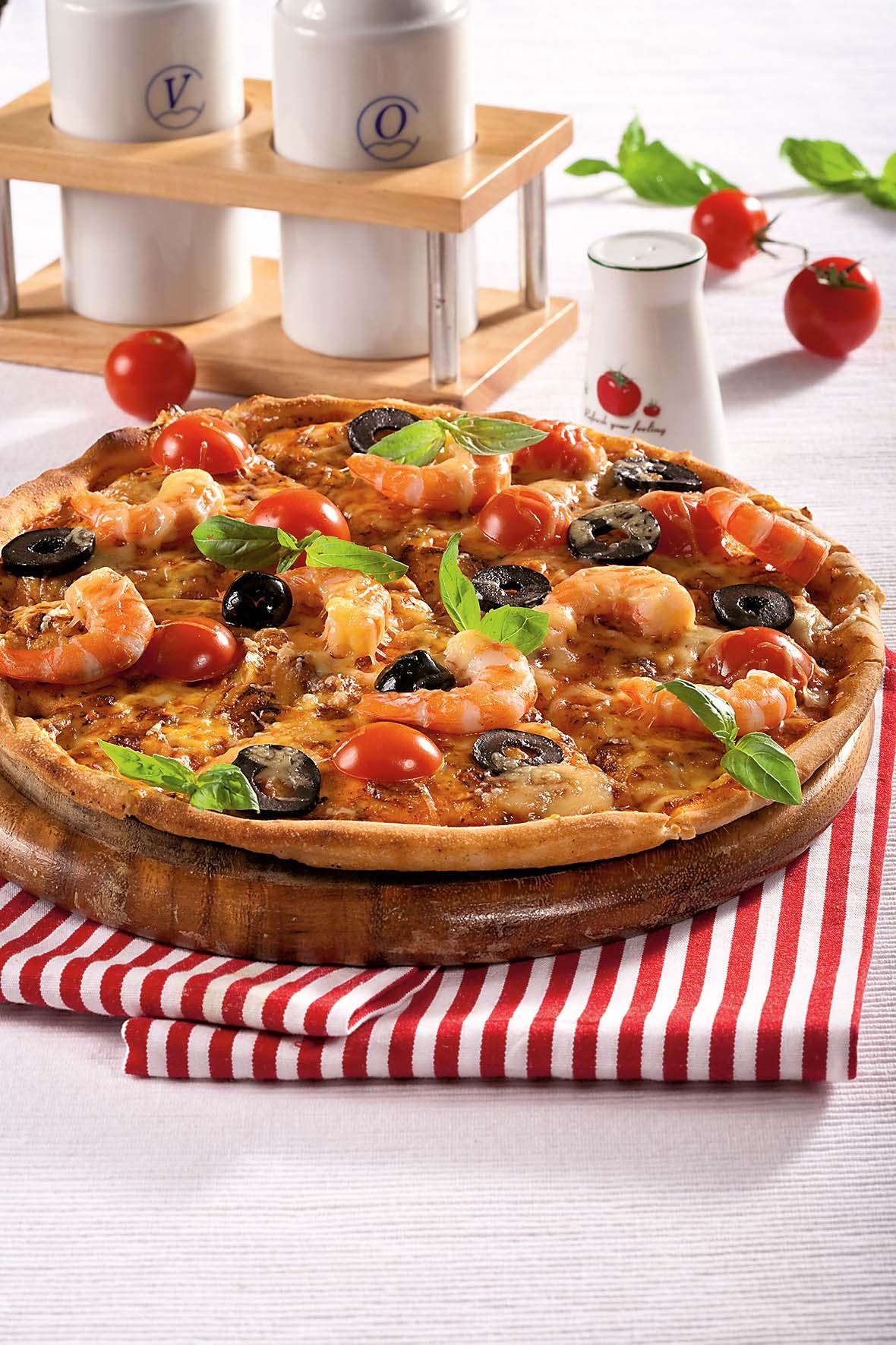 4. Духовку предварительно разогреть до 180°. Тесто раскатать в круглый пласт и смазать оставшимся оливковым маслом. Сверху уложить креветки, помидоры черри, маслины, посыпать тертым сыром и базиликом. Выпекать в духовке 15–20 мин.