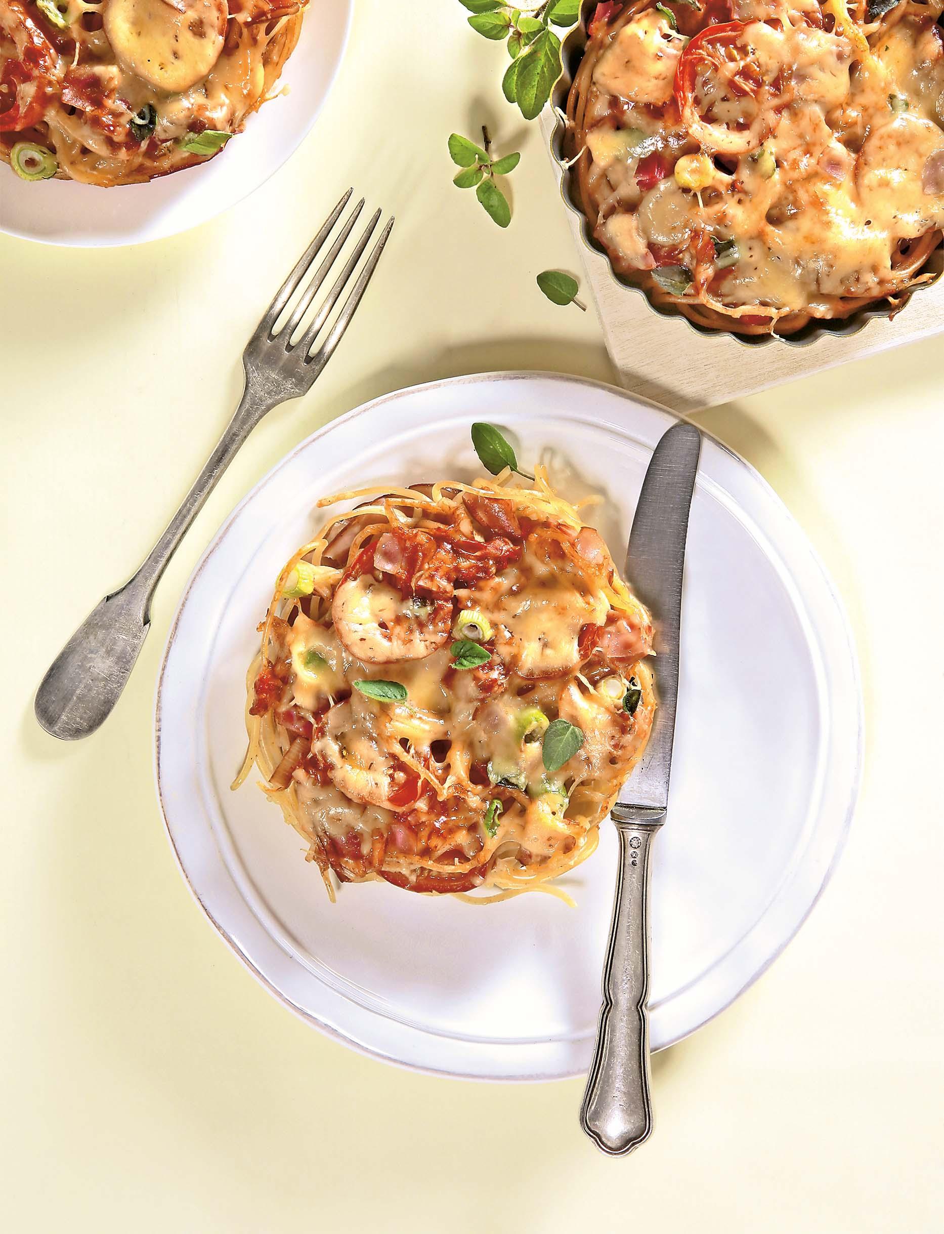 3. Ветчину мелко нарезать (4 ломтика отложить). Помидоры нарезать кружками, зеленый лук – колечками. Каждый ломтик ветчины разрезать на две полоски и выстлать ими смазанные жиром порционные формочки диаметром 14 см. Спагетти перемешать с луком, чесноком, ветчиной, помидорами, душицей и 80 г сыра. Распределить смесь по формочкам, посыпать оставшимся сыром и запекать 15 мин.