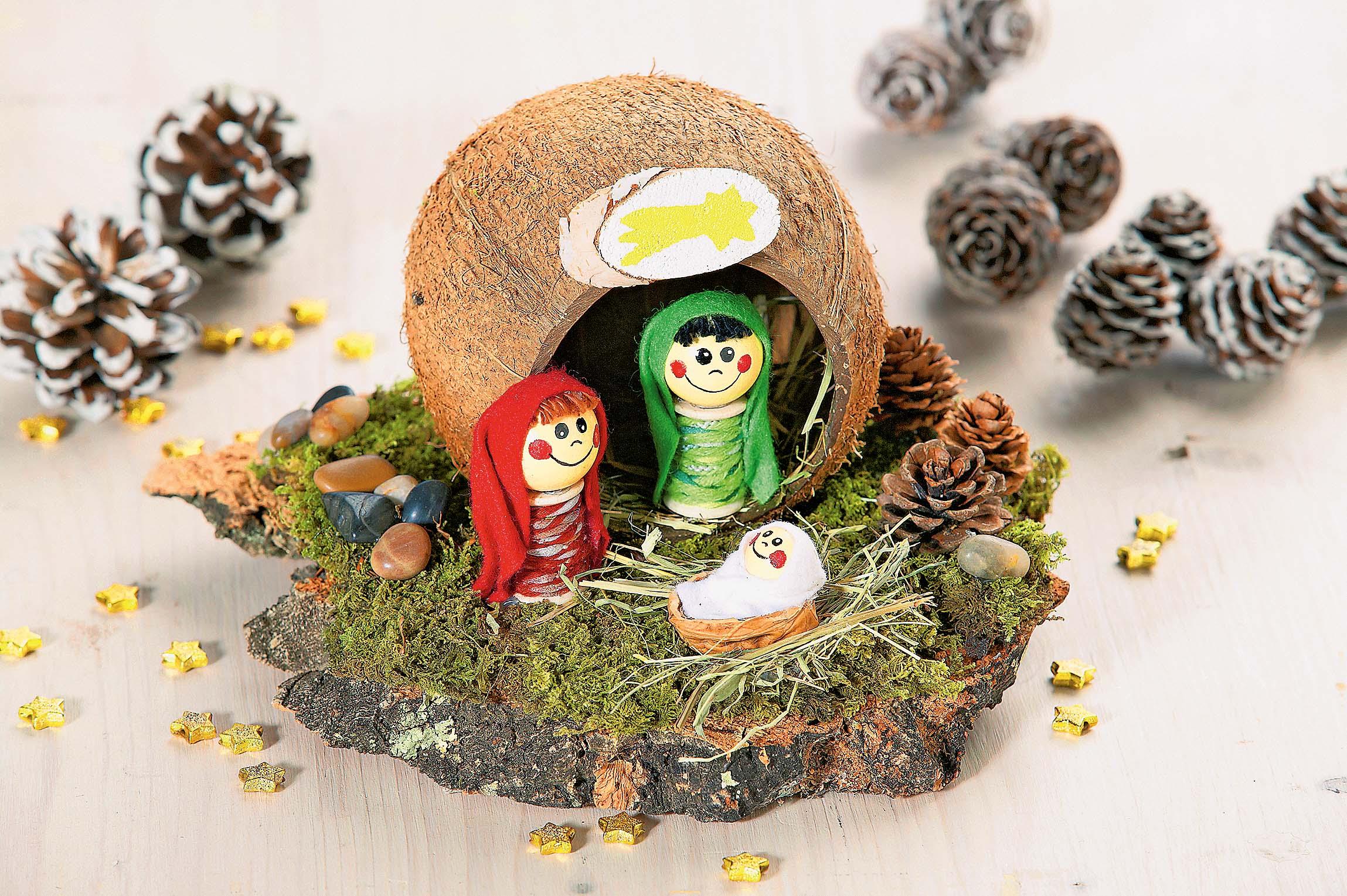 К спилу с корой приклеиваем кокос, пространство вокруг декорируем мхом. Скорлупу изнутри выкладываем соломой, небольшой пучок приклеиваем рядом с колыбелью. Приклеиваем фигурки. Дополняем картину шишками и камешками (задача для малыша).