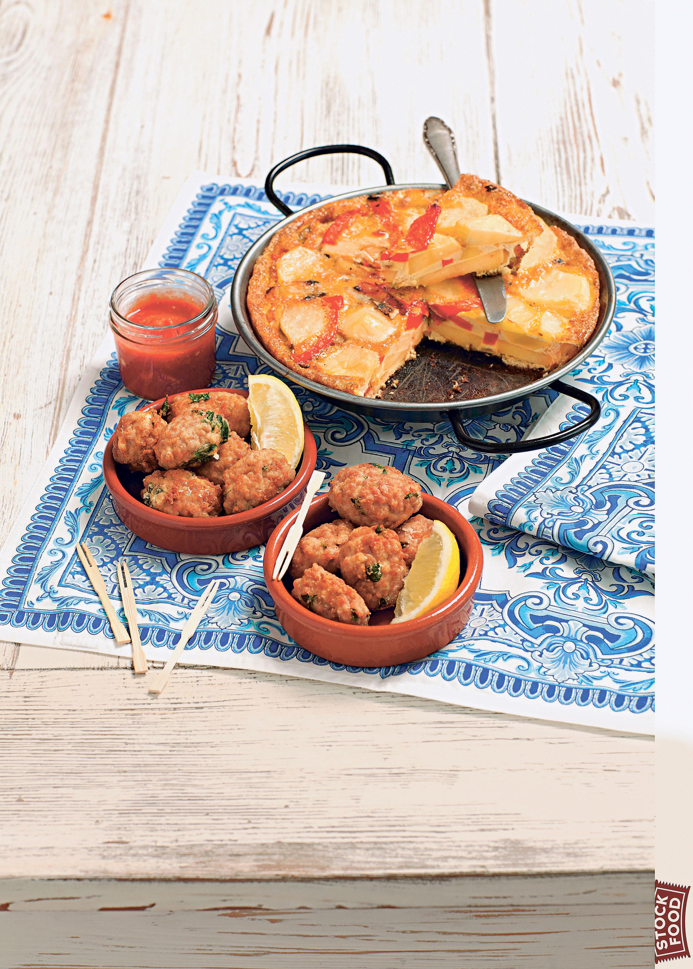 На 4 порции: •1 ломтик белого хлеба •700 г картофеля •600 г рубленой говядины •9 яиц •2 ст. л. рубленой петрушки •по 1 стручку красного и желтого сладкого перца •1 небольшая луковица •1 зубок чеснока •3 ст. л. оливкового масла •4 ст. л. молока •соль •молотый черный перец