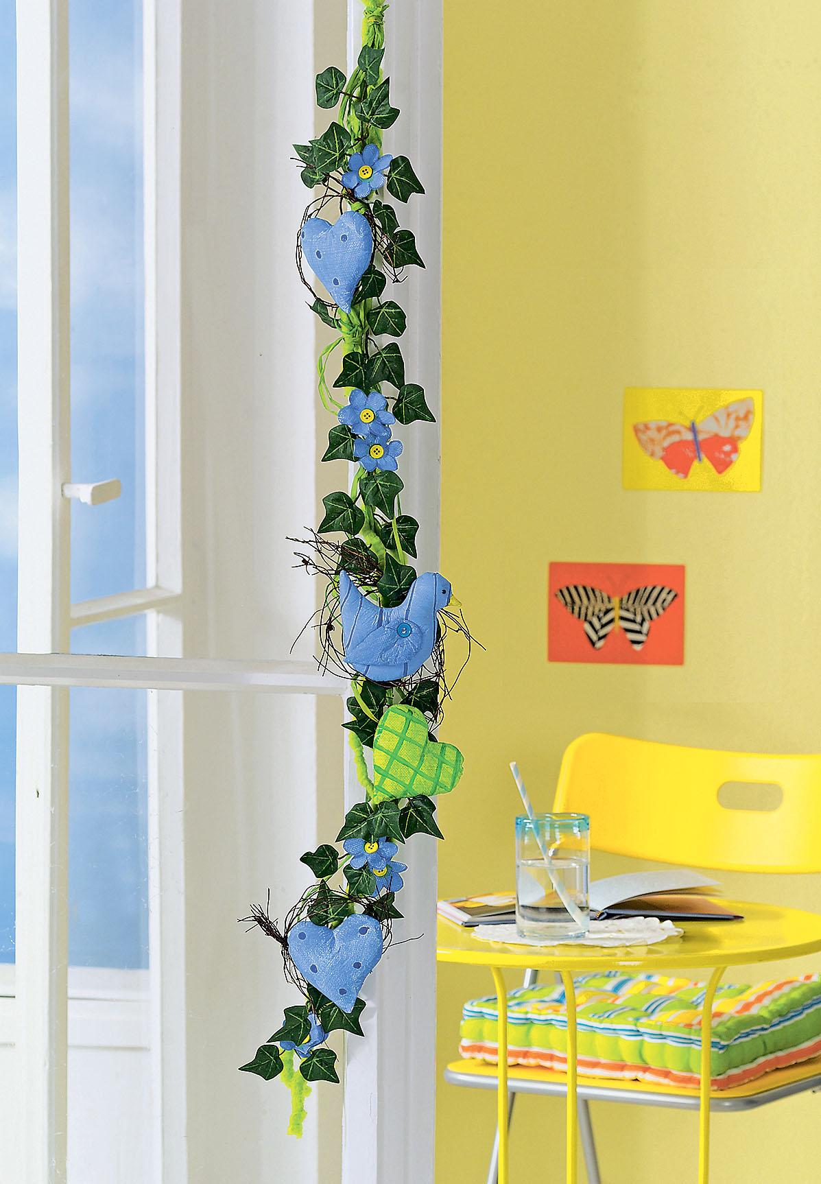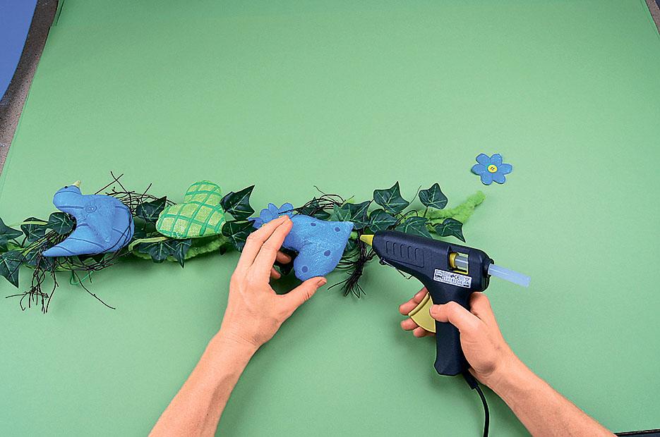 Шаг 2 Побег плюща обвить вокруг шерстяного шнура, в отдельных местах закрепив проволокой. Расположить вдоль гирлянды птиц, сердечки и цветы. Приклеить их горячим клеем.