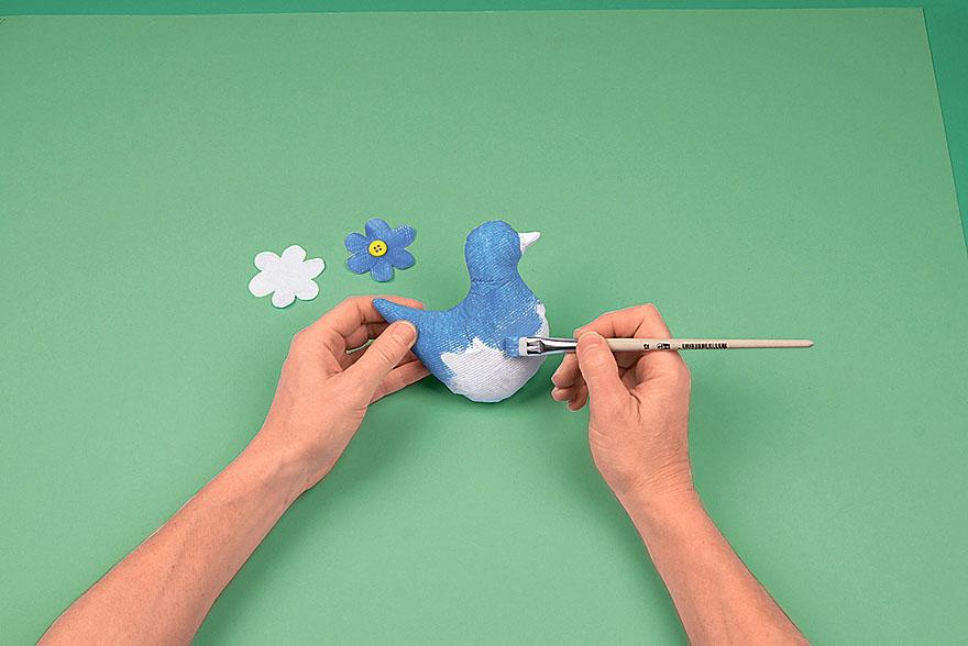Шаг 1 Вырезать из тайвека фигурки птиц, сердечки, цветы. Птиц и сердечки сшить, набить ватой. Раскрасить все детали декора акриловыми красками. К цветам пришить серединки-пуговицы.