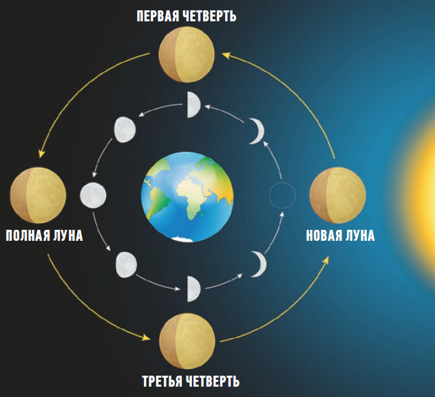 Каждый месяц Луна проходит четыре фазы. Растет в течение 15 дней, достигает своего предела – полнолуния – и после столько же дней убывает. По окончанию цикла – на 30 лунные сутки – небо почти не освещается.