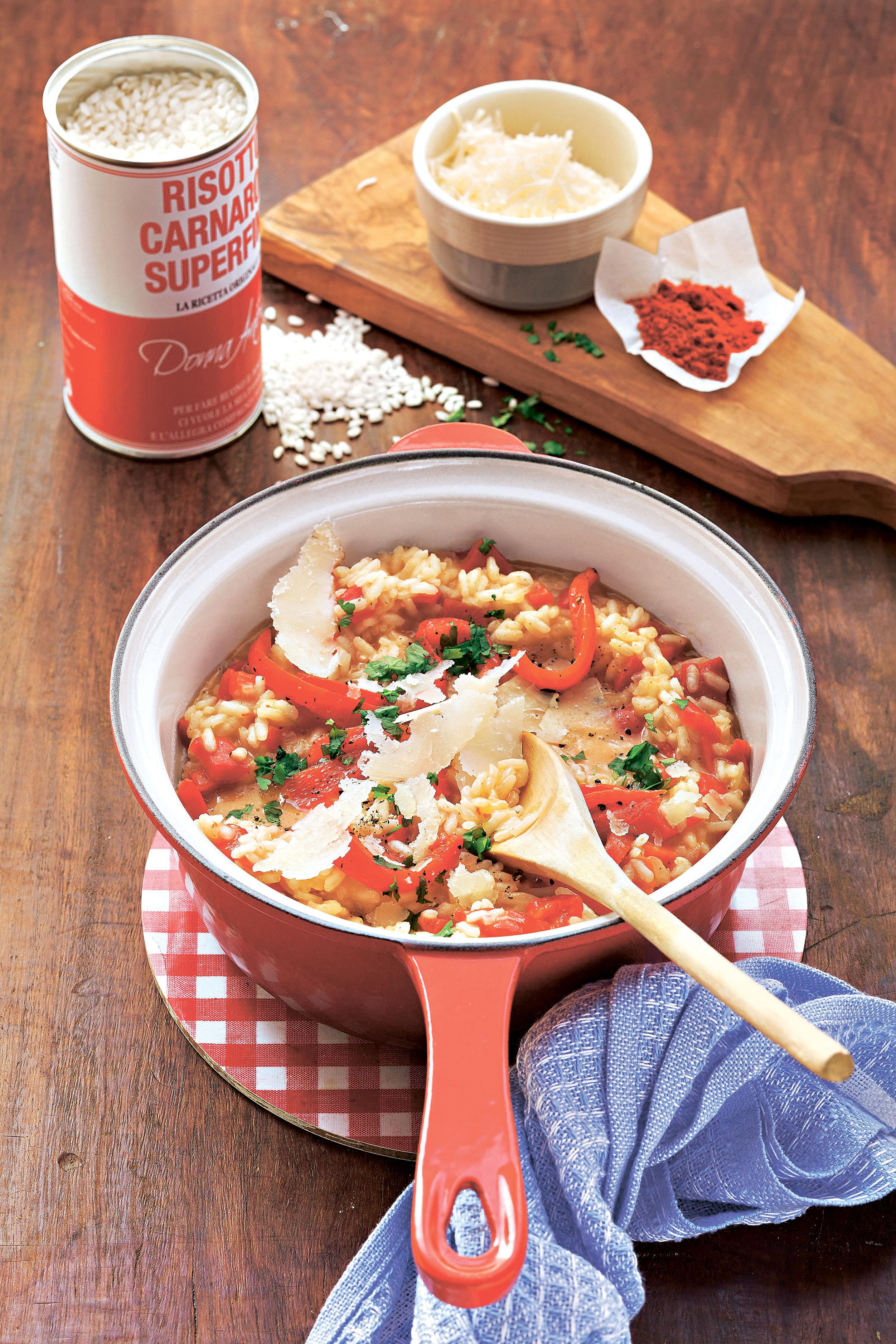 На 4 порции: •4 крупных стручка сладкого перца •1–2 ст. л. растительного масла •2 небольшие луковицы •130–150 г сливочного масла •300 г круглого риса •2 ч. л. молотой паприки •100–150 мл сухого белого вина •1 л куриного или овощного бульона •100 г твердого сыра •соль •молотый черный перец