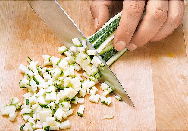 Цукини вымыть, обсушить и нарезать небольшими кубиками. Петрушку вымыть, обсушить и, удалив грубые стебли, мелко порубить.