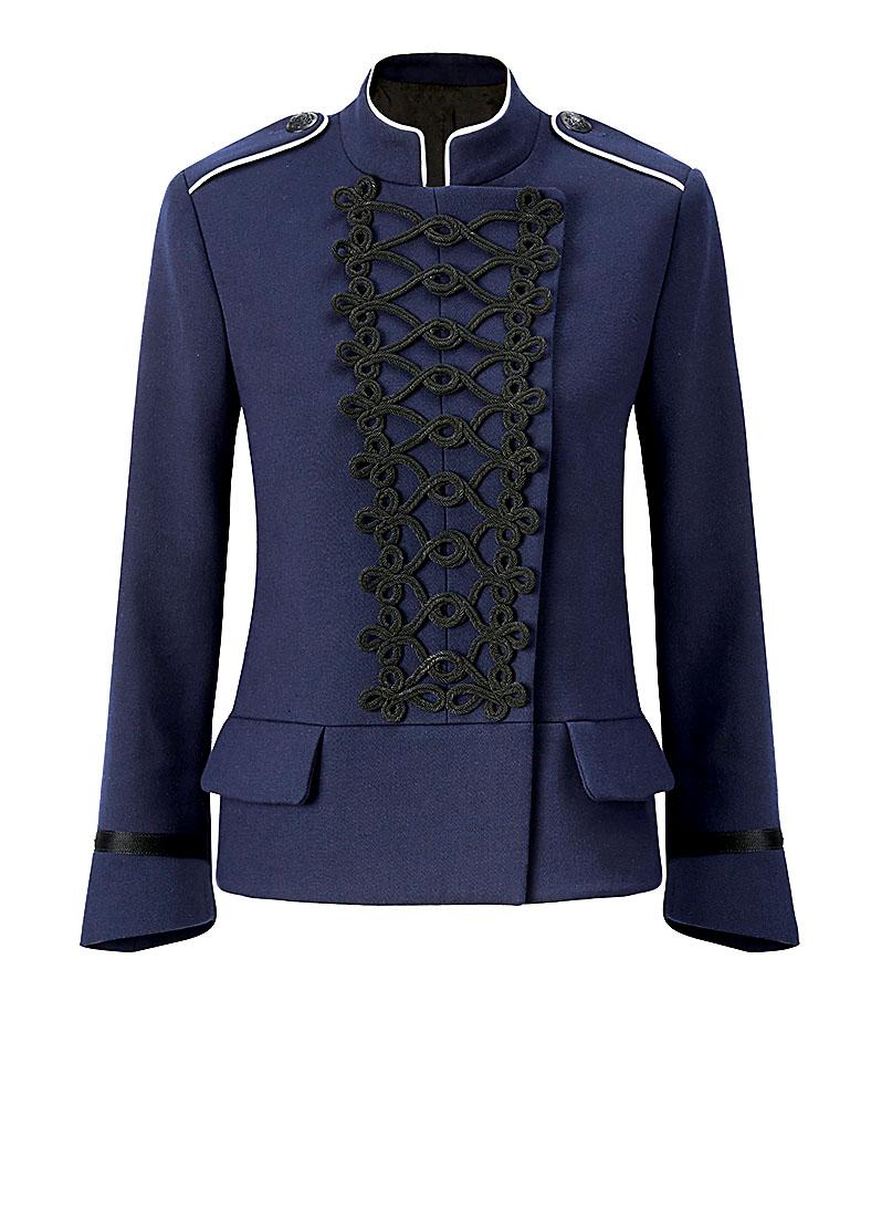 Жакет с отделкой в стиле милитари комбинируй с брюками: спортивными с лампасами и кроссовками или с широкими палаццо и ботильонами на каблуке