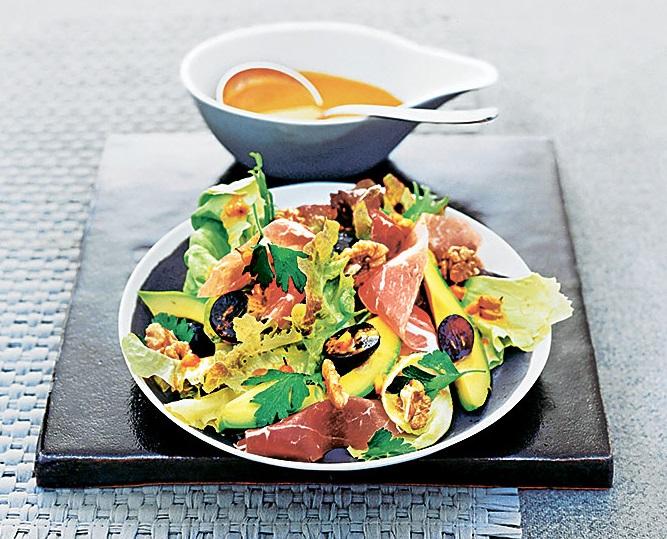 На 4 порции: •1/2 авокадо •300 г красного винограда •50 г ядер грецких орехов •100 г ветчины •3 веточки петрушки •100 г листьев салата •50 мл сока облепихи •2 ч. л. оливкового масла • 1 ч. л. бальзамического уксуса •1/2 ч. л. меда •соль, перец