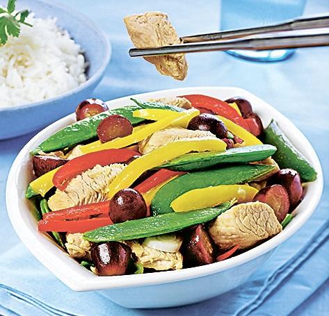 На 4 порции: •600 г куриного филе •по 1 красному и желтому болгарскому перцу •150 г стручков горошка •150 г красного винограда •3 перышка зеленого лука •2–3 ст. л. оливкового масла •соль, перец. Для соуса: •2 ст. л. рисового уксуса •2 ст. л. кунжутного масла •3 ст. л. овощного бульона