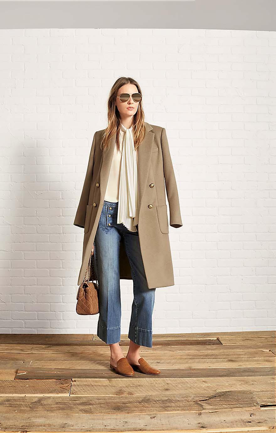 Двубортное приталенное пальто как модная униформа подходит даже к потертым джинсам и юбкам из денима.