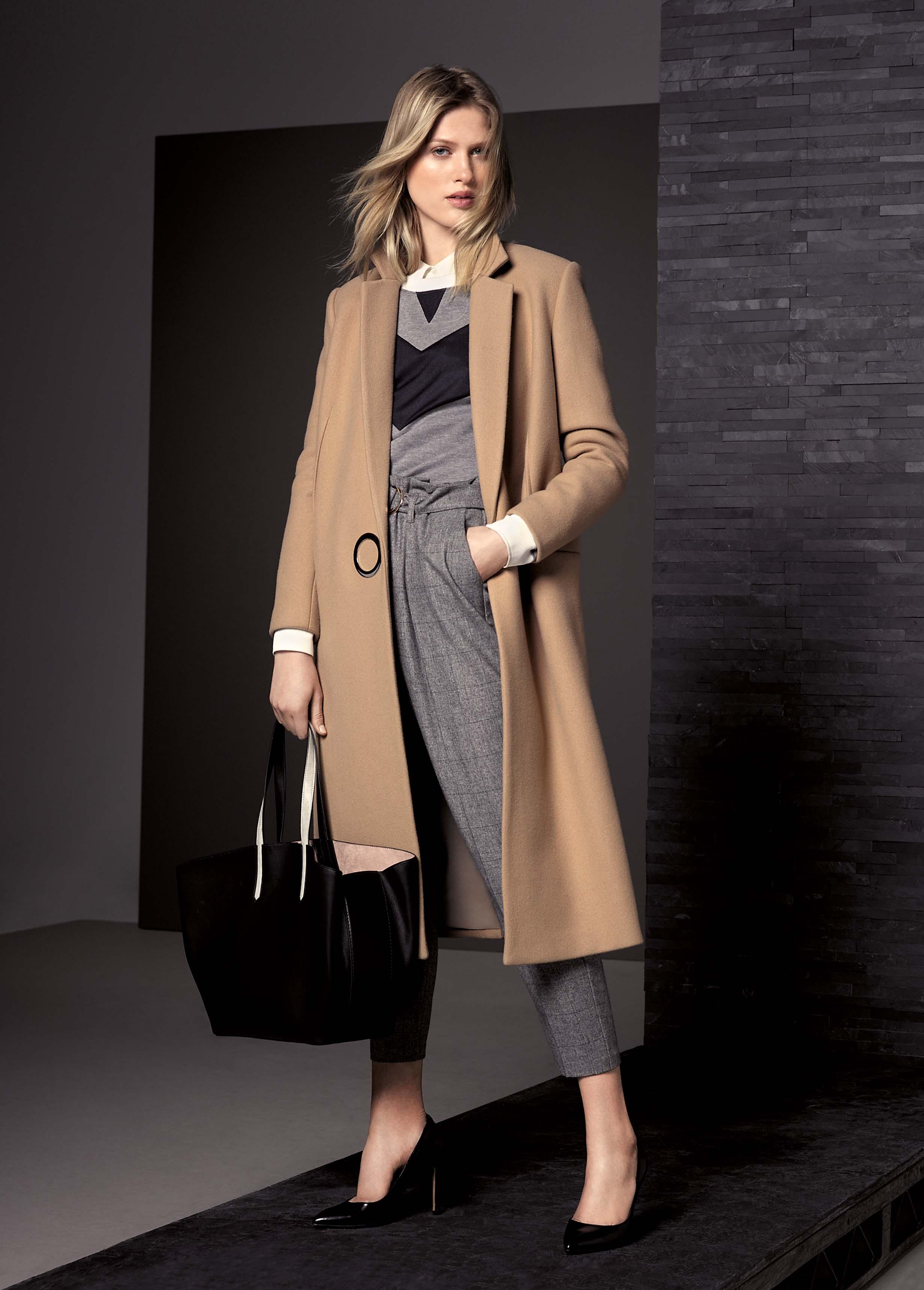 С бежевым пальто комбинируй одежду в черно-бело-серой гамме. Для делового дресс-кода подойдет идеаально.