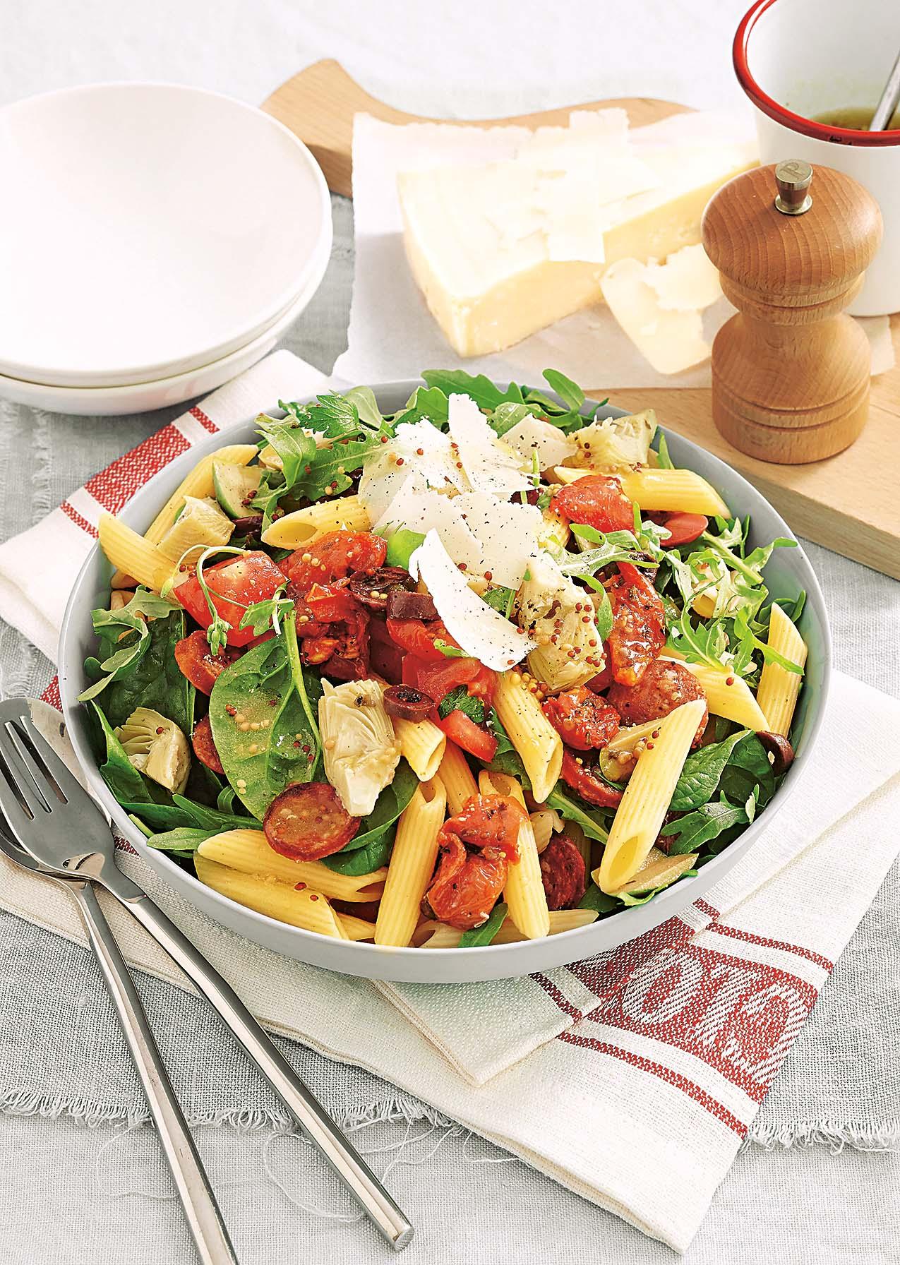 •400 г пенне (перьев) •6 ст. л. оливкового масла •100 г салями •200 г консервированных артишоков или сладкого перца •150 г помидоров черри •2 ст. л. черных оливок •2 ст. л. вяленых томатов •50 г рукколы •50 г шпината •2 ст. л. винного уксуса •1 ст. л. горчицы •50 г наструганного сыра •соль •молотый черный перец