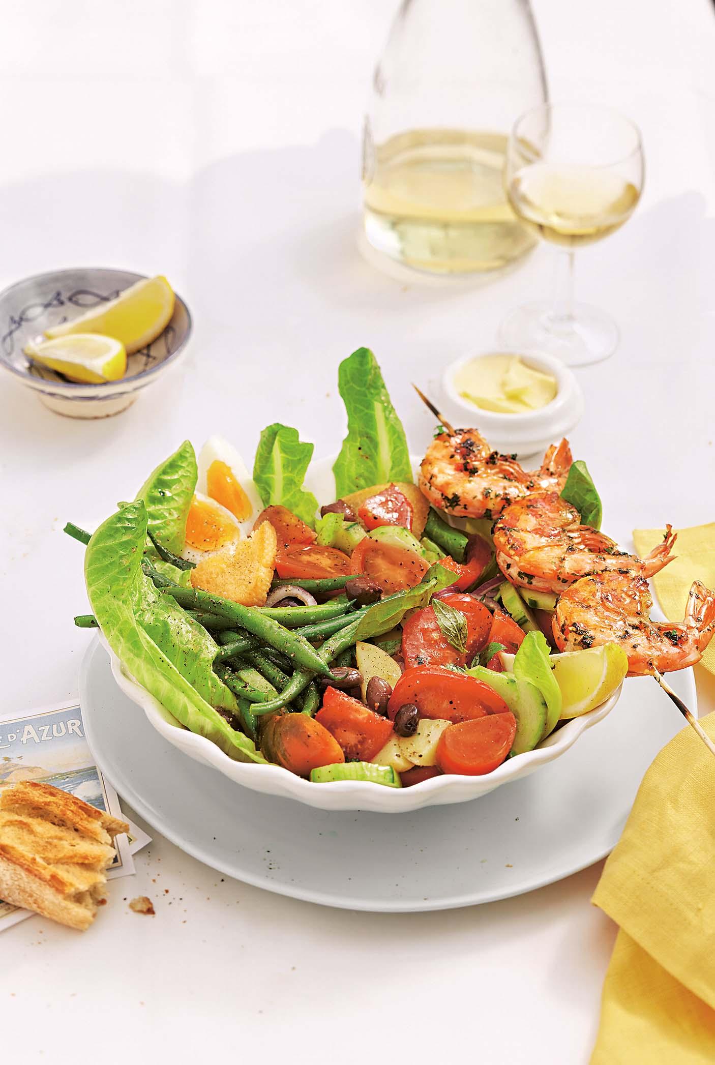 •12 замороженных очищенных креветок •5 веточек петрушки •1–2 зубка чеснока •10 ст. л. оливкового масла •2 ломтика белого хлеба •200 г замороженной стручковой фасоли •2 клубня картофеля •2 яйца •1 огурец •600 г помидоров черри •1 луковица •2 ч. л. горчицы •2 ст. л. уксуса •80 г черных оливок •70 г салата •соль •молотый черный перец