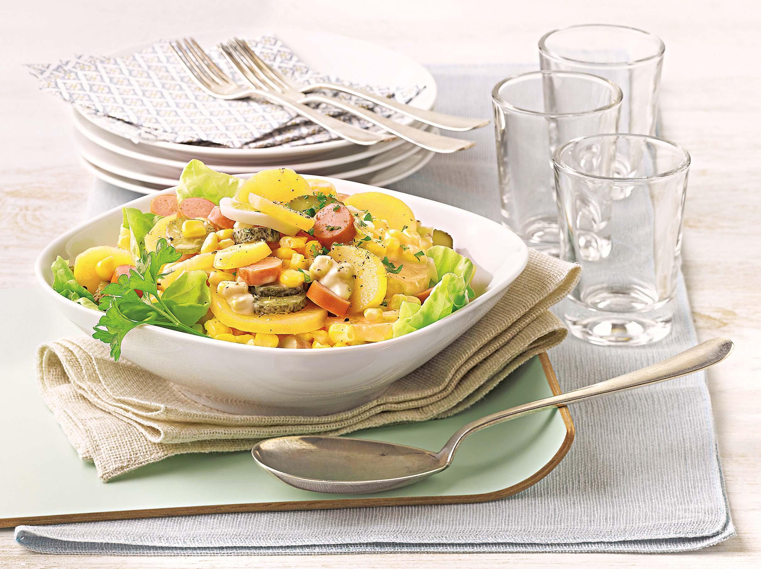 •700–750 г картофеля •1 луковица •120 мл бульона •2 ч. л. сахара •3 ст. л. уксуса •4 маринованных огурца •4 колбаски •4 сваренных вкрутую яйца •200 г консервированной кукурузы •1 ст. л. консервированного хрена •2 ст. л. майонеза •150 мл сметаны •2 ст. л. сока лимона •1 ст. л. рубленой зелени •соль •молотый черный перец
