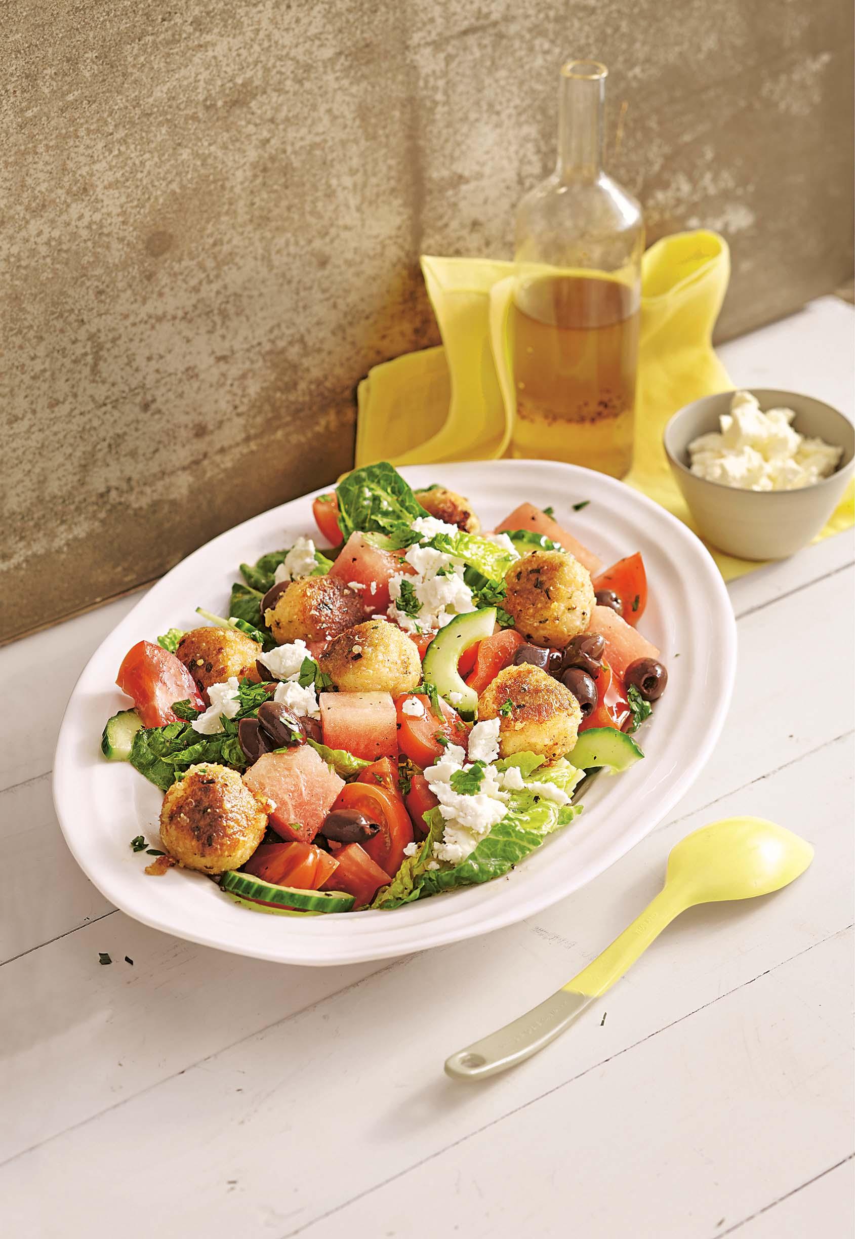 •2 клубня картофеля •150 г киноа •150 г консервированной фасоли •1 зубок чеснока •4 стебля зеленого лука •2 веточки петрушки •150 г сыра фета •1 желток •120 г листьев салата •400 г помидоров •1 огурец •500 г мякоти арбуза •50 г черных оливок •8 ст. л. оливкового масла •1 ст. л. сока лимона •соль •молотый черный перец