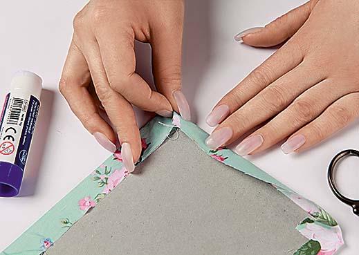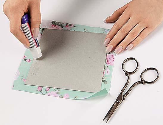 Вырежь из картона квадрат. Выкрои другой квадрат из ткани – на 2 см больше. Смажь края клеем.