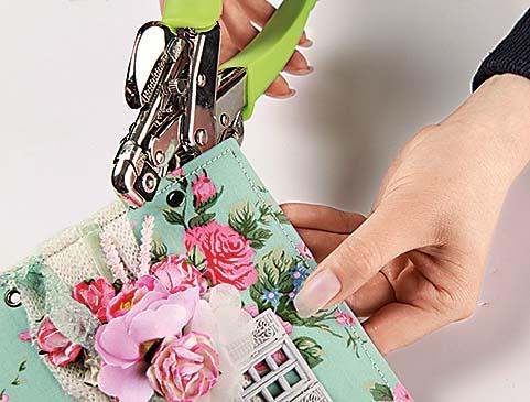 • картон • ткань с принтом • бумага, люверсы и соединительные кольца для скрапбукинга • цветы, пуговицы • дырокол