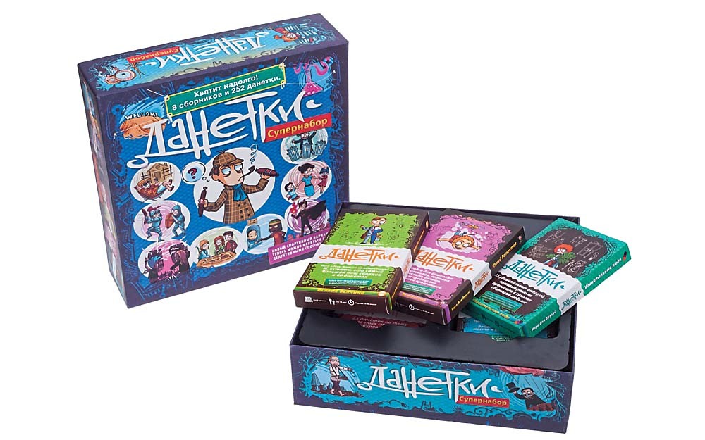 Знаешь игру «Верю – не верю»? Здесь принцип тот же. Ведущий описывает ситуацию, а игроки задают вопросы, которые помогут разобраться, что это было. Отвечать можно только «Да» или «Нет». Есть много версий «Данеток»: от детективных историй до случаев из жизни. Но можно купить и набор с 8 тематическими сборниками.