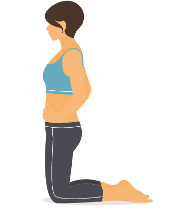 3. Встань на колени, пальцы ног при этом должны быть прижаты к полу. Руки расположены на бедрах, подбородок прижат к груди. Затем на вдохе подними подбородок и плечи вверх и медленно прогни спину назад. Далее на выдохе медленно вернись в вертикальное положение.