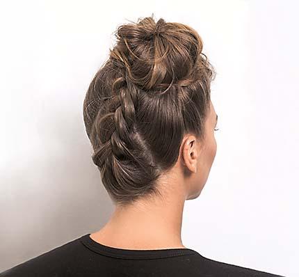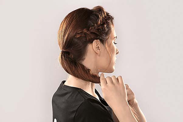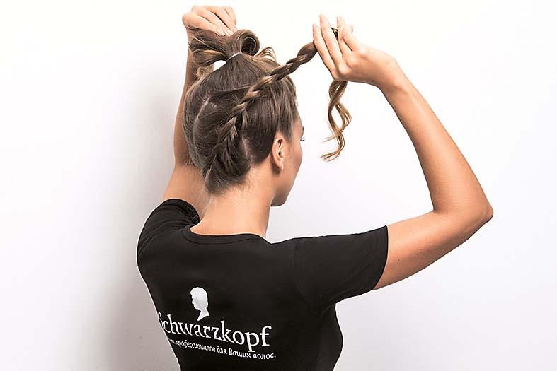Заплети из пряди косу. Остальные волосы собери в высокий хвост и заверни его пучком.