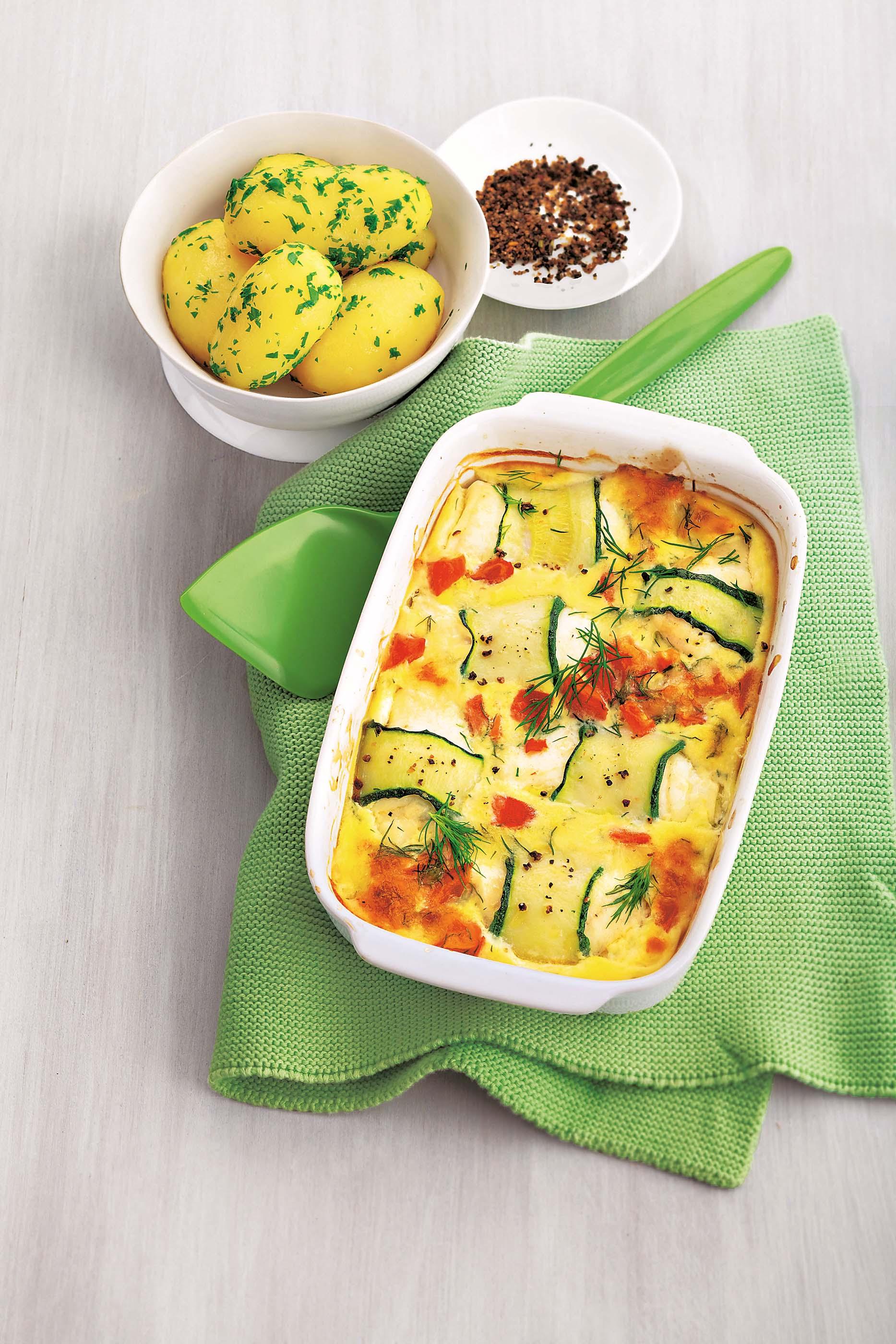 • 2 больших цукини • 12 маленьких филе белой рыбы (по 60 г) • 4 ст. л. сока лимона • 4 помидора • 4 веточки укропа • 3 яйца • 300 мл сметаны (жирность 20%) • 100 мл молока • 1 зубок чеснока • 100 г тертого сыра • соль • молотый черный перец