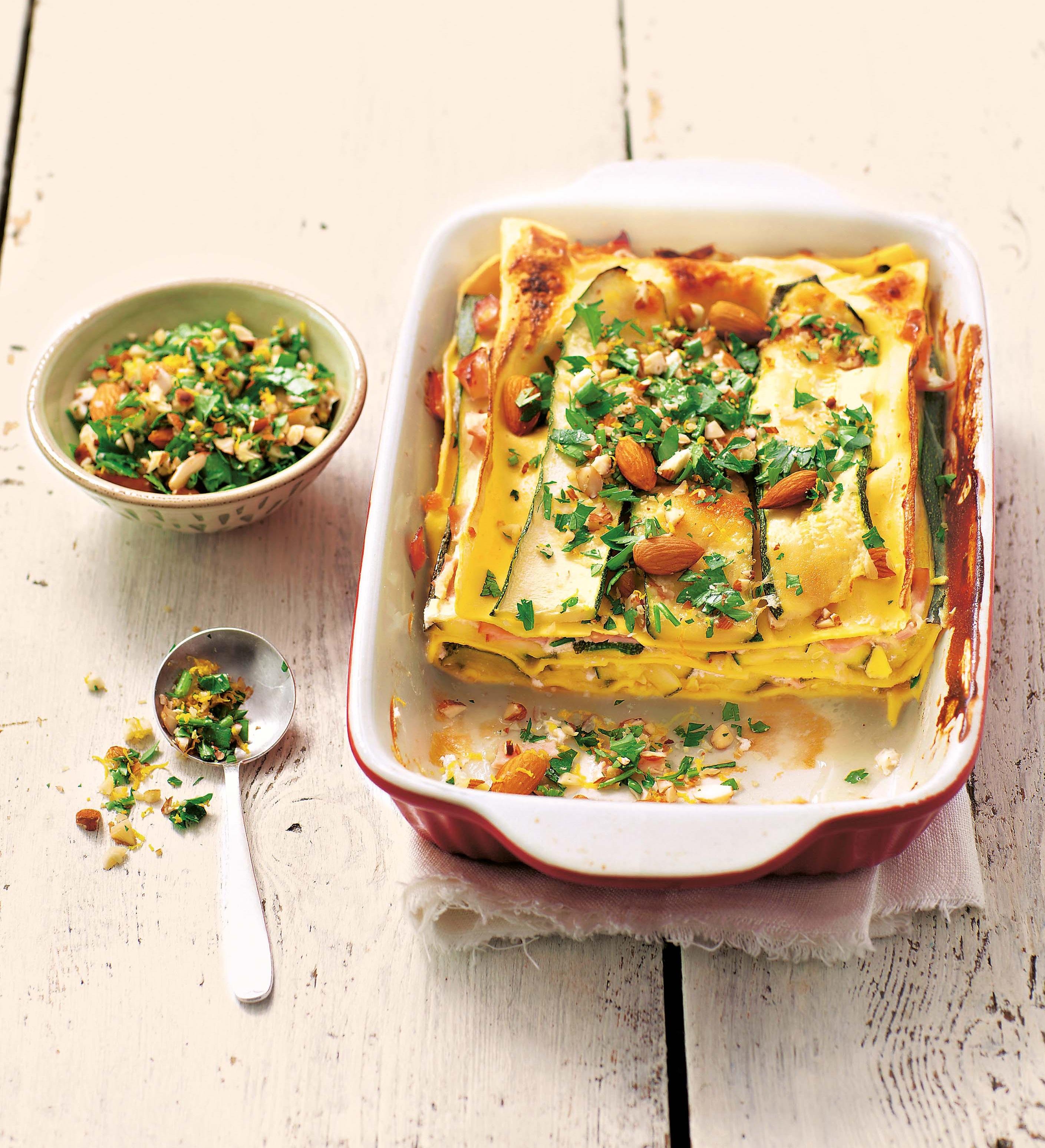 4. В небольшую форму, смазанную любым жиром, уложить слоями листы лазаньи и ломтики цукини, посыпая каждый миндальной смесью и раскрошенным сыром фета. Залить винно-бульонной смесью и запекать 20 мин. Перед подачей дать немного остыть.