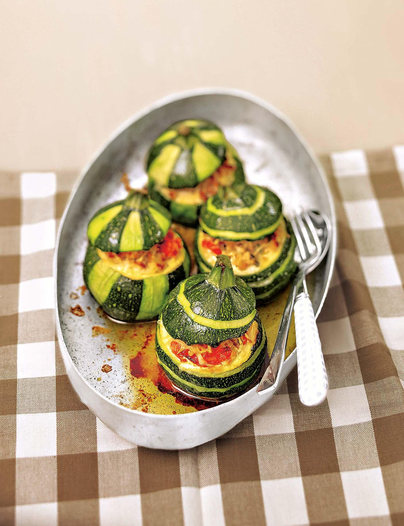 4. Тушеные овощи разложить по цукини. Посыпать тертым сыром, сбрызнуть оставшимся маслом и накрыть верхушками. Запекать около 20 мин.