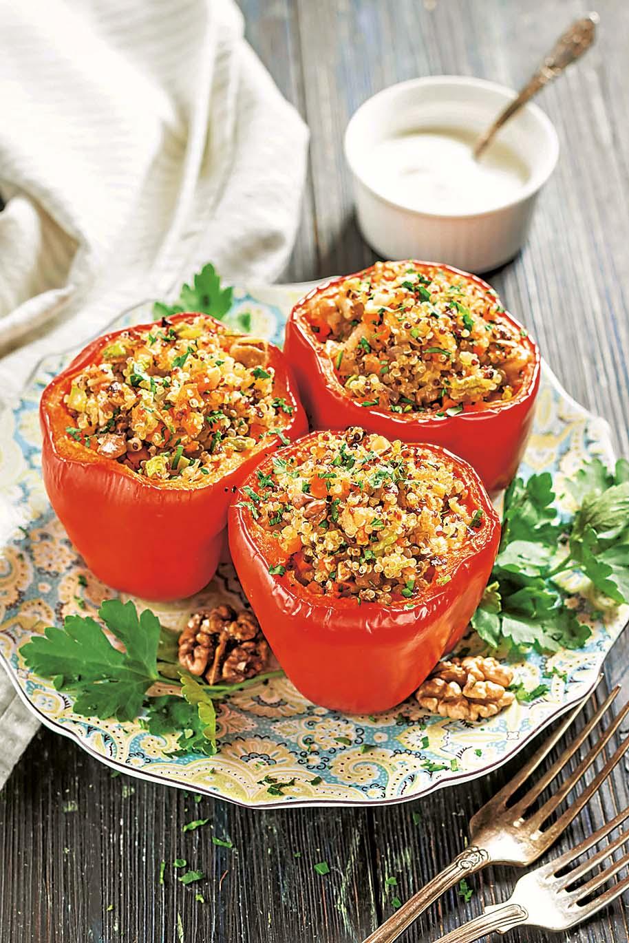 В сковороде обжарь мелко нашинкованный лук и натертую морковь. Добавь нарезанные шампиньоны и пассеруй еще 1–2 минуты. Добавь заранее отваренный рис и нарезанные кубиками помидоры. Перемешай, посоли и поперчи. Когда начинка будет готова, добавь в нее чиа и перемешай. Обработай перец: удали верхушки и семена. Обдай кипятком, чтобы перец стал мягким. Начини его фаршем и выложи в пароварку. Или запекай в духовке при температуре 180° 20 минут.