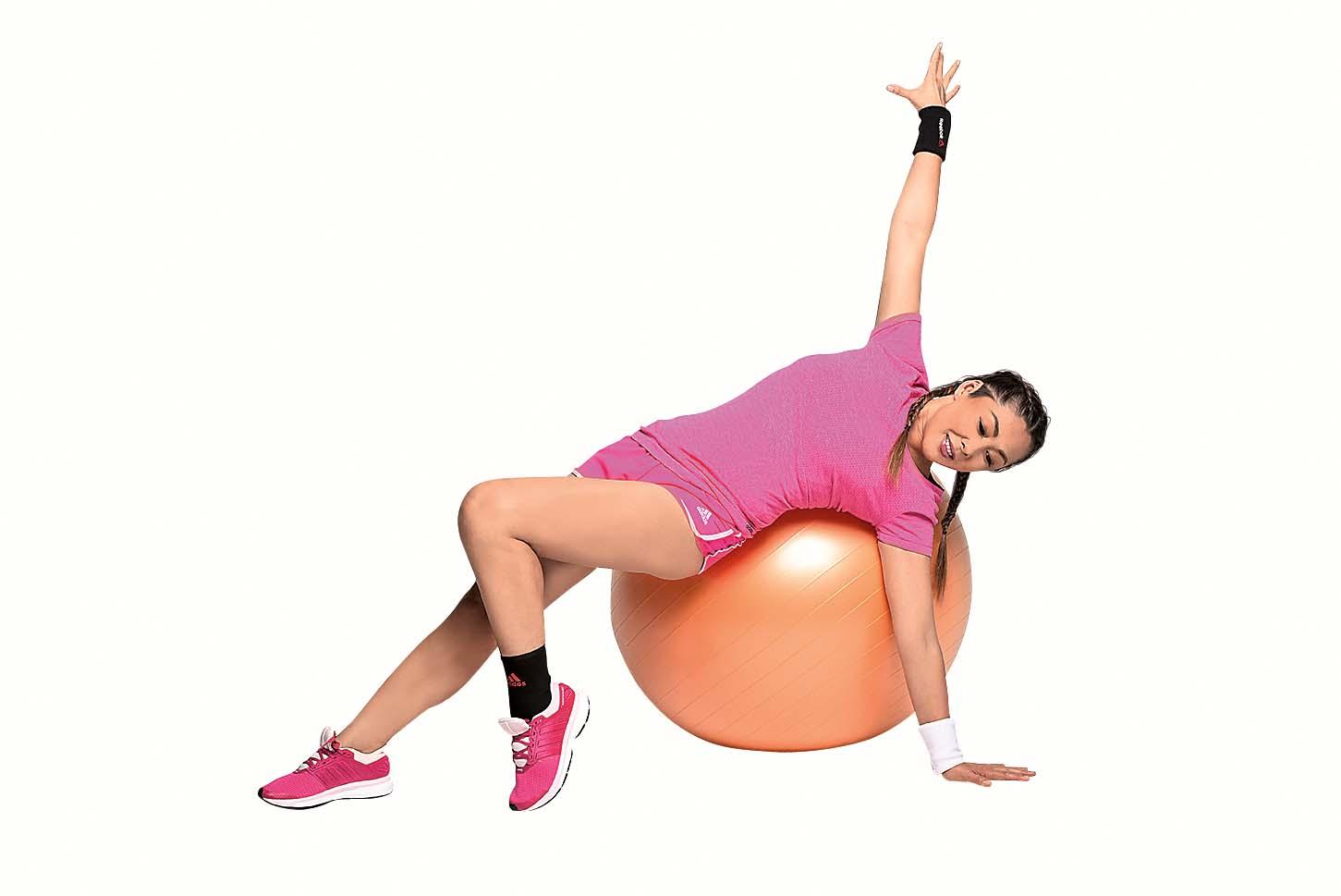 Укрепляют пресс и косые мышцы живота. Ляг спиной на мяч, руки в стороны. На вдохе медленно скручивай корпус, касаясь левой рукой пола и одновременно сгибая ногу в колене. На выдохе вернись в исходное положение. Сделай 2 таких подхода по 10 раз в каждую сторону.