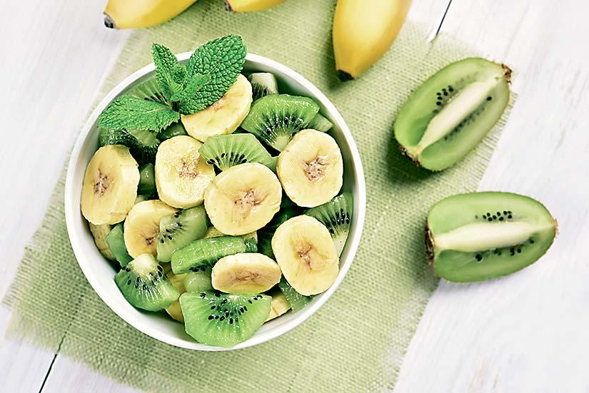 киви и банан очисти от кожуры и нарежь кубиками или тонкими кружочками. Смешай лимонный сок с листьями мяты и взбей. Добавь нарезанные фрукты и хорошенько перемешай. Помести готовый салат в холодильник на 10–15 минут.