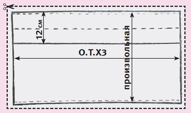 Отмерь сверху 12 см и проведи по всей ширине ткани черту мелом. Эта часть – для резинки. Сложи ткань пополам, прошей. Теперь раздели на четыре части, отметь мелом и снова прошей. Резинка получится четырехуровневая!