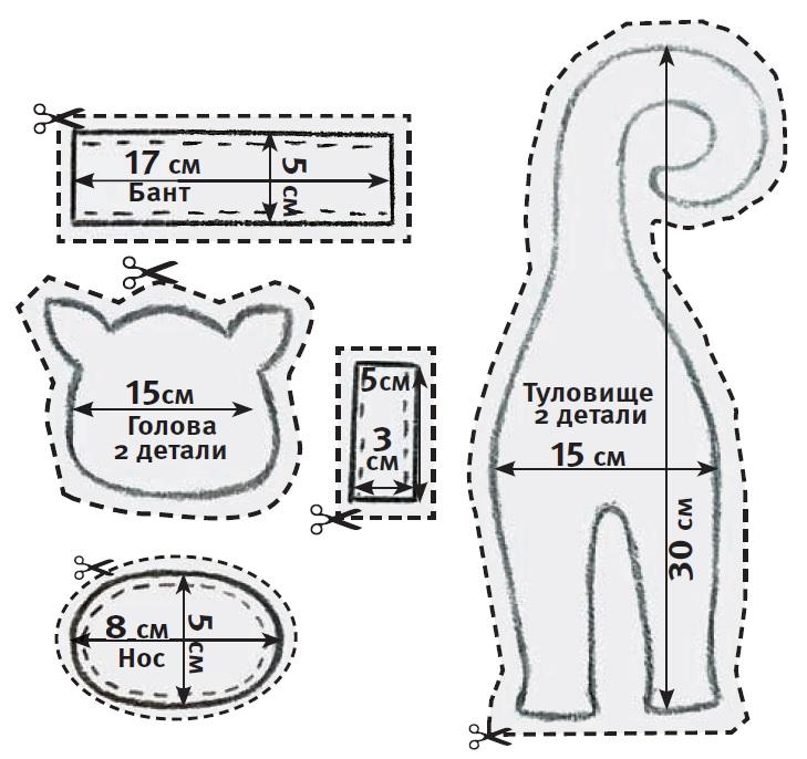 • Светлая ткань 45х30 см • Кусочек темной ткани для банта и носа 30х5 см • Веревка-бечевка для усов и хвоста – 1 м • Одна большая пуговица и 2 маленьких • Черная плотная нитка для вышивки мордочки (пряжа или мулине) • Синтепон