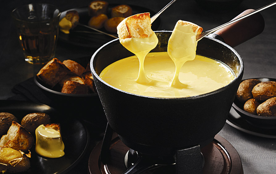 Слово имеет французское происхождение и в переводе означает «таять». А появилось это блюдо примерно в XIV веке. Тогда для перекусов деревенские погонщики брали с собой самые доступные для них продукты – хлеб, сыр и вино. Емкость для готовки у них была такая же, как у их испанских коллег, – глиняный горшочек. Туда они наливали расплавленный сыр, перемешанный с вином, а после обмакивали в эту консистенцию кусочки хлеба. В высшем свете это блюдо стали готовить из самых дорогих видов сыра и вина. Сейчас классический рецепт фондю – это два вида швейцарского сыра – грюйер и эмменталь, растопленных в сухом белом вине. Некоторые повара добавляют в полученную смесь вишневую водку, или кирш.