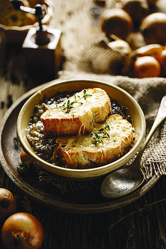 Сейчас луковый суп делают немного иначе. Это довольно густая похлебка, которую готовят на говяжьем, курином или овощном бульоне. Иногда в нее добавляют вино, коньяк или херес. Также в качестве украшения суп посыпают сухариками.