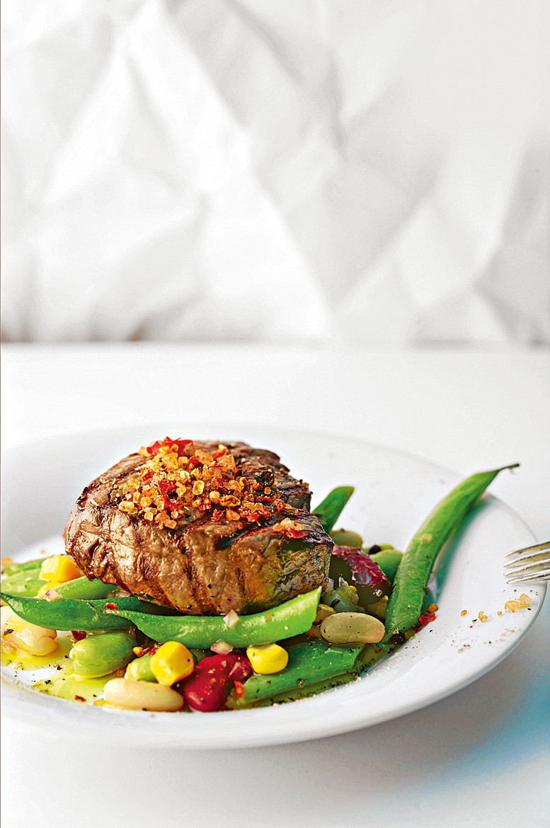 Приготовление: Мясо слегка отбей, посыпь специями и сбрызни растительным маслом. Обжарь стейк на сковороде-гриль сначала с одной стороны в течение 20 секунд, потом с другой, чтобы все соки остались внутри. Убавь огонь до среднего и продолжай жарить стейк еще 10–15 минут (в зависимости от степени прожарки, которую предпочитаешь). Подавай стейк с гарниром из отварной или тушеной стручковой и цветной фасоли.