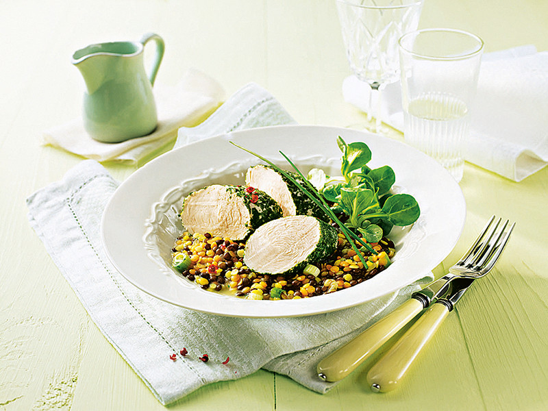 Приготовление: Промой филе прохладной водой и обсуши бумажным полотенцем. Смешай в миске 2 ст. л. растительного масла, зелень, соль и перец. Консистенция должна получиться густой. Этой смесью натри мясо. Затем заверни его в несколько слоев фольги так, чтобы при запекании не вытекал сок. Разогрей духовку до 2000 С. Помести в нее мясо и запекай примерно час. Готовое мясо достань из фольги, нарежь и подавай на стол. На гарнир отвари красную и желтую чечевицу.