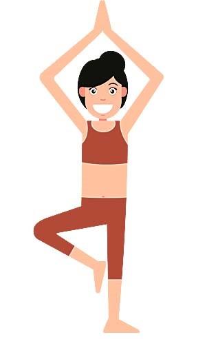 Соедини руки над головой. Перенеси вес тела на левую ногу. Правую согни в колене и поставь стопу на внутреннюю сторону левой лодыжки. Затем поменяй ногу.