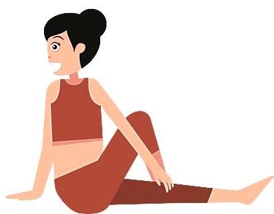 Сидя на полу, левую ногу вытяни, правую ногу согни в колене. Левой рукой возьми себя за правую стопу. И посмотри за правое плечо. Затем повтори упражнение в другую сторону. И так 5–10 раз.