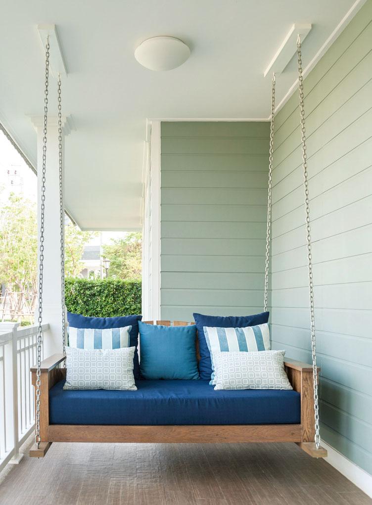 Чтобы сохранить ощущение свободного пространства вместо обычного дивана на веранде можно разместить диван-качели (если позволяют потолочные конструкции).