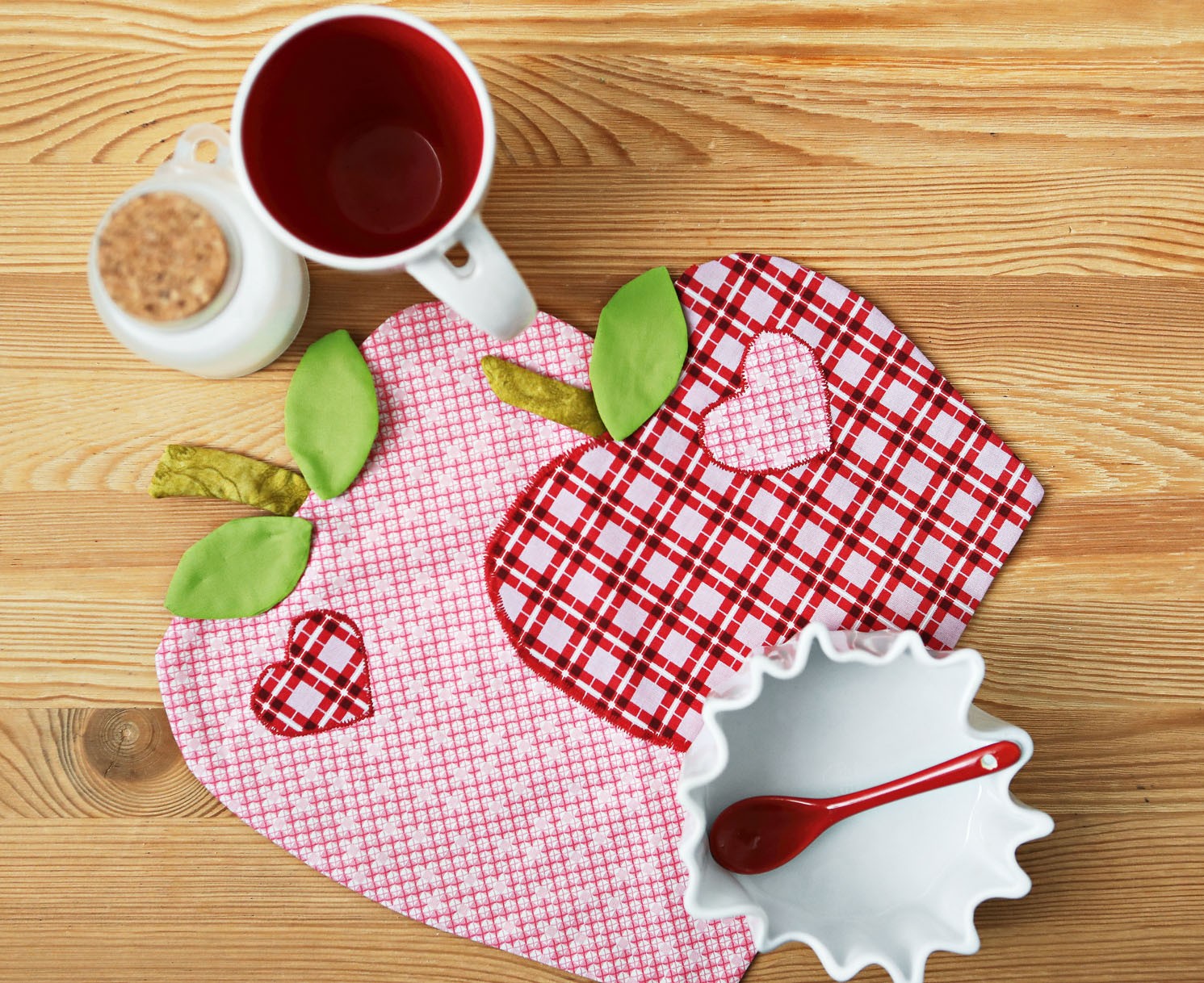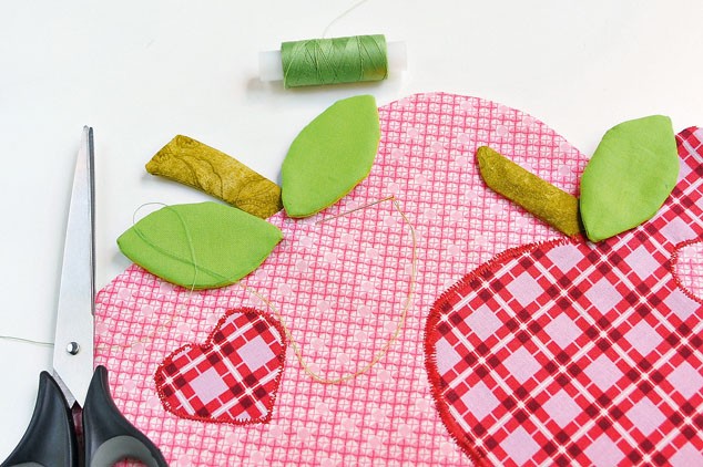5. К яблокам прикалываем иглами сердечки, сместив их от центра. Притачиваем сердечки по контуру мелким зигзагом.