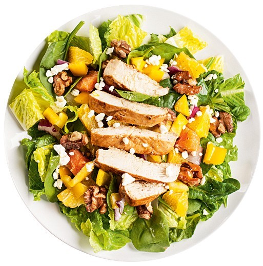 Приготовление: Куриные грудки обжарь в сковороде без масла. Нарежь перец, измельчи орехи. Листья салата соедини с остальными ингредиентами, добавь специи, заправь нежирной сметаной.