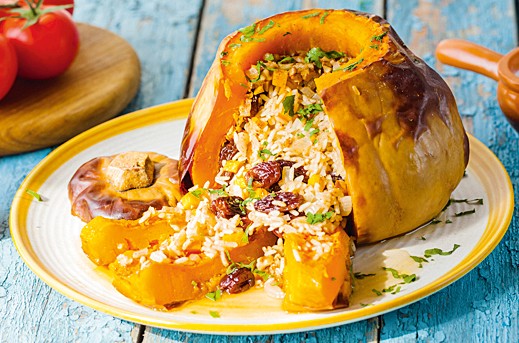 Приготовление: Смешай рис с изюмом и помести в тыкву со срезанной верхушкой (начинка должна занять не больше половины объема тыквы). Добавь соль. Залей водой, чтобы она прикрыла рис на 1 см. Смажь внешнюю сторону тыквы растительным маслом, закрой «крышечкой» и запекай 1,5 часа.